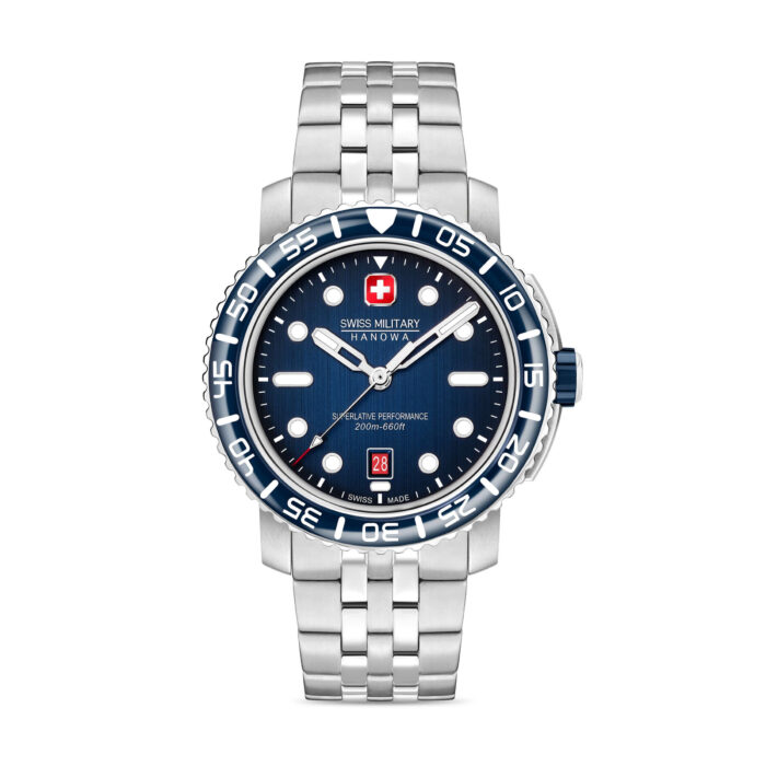 Case diameter: 44 MM. Case color: STAINLESS STEEL (OR) SILVER COLOR. Case material: STAINLESS STEEL. ATM: 20 Crystal: CLEAR DOMED SAPPHIRE GLASS. Dial color: BLUE. Strap typ: METAL BRACELET. Strap material: STAINLESS STE