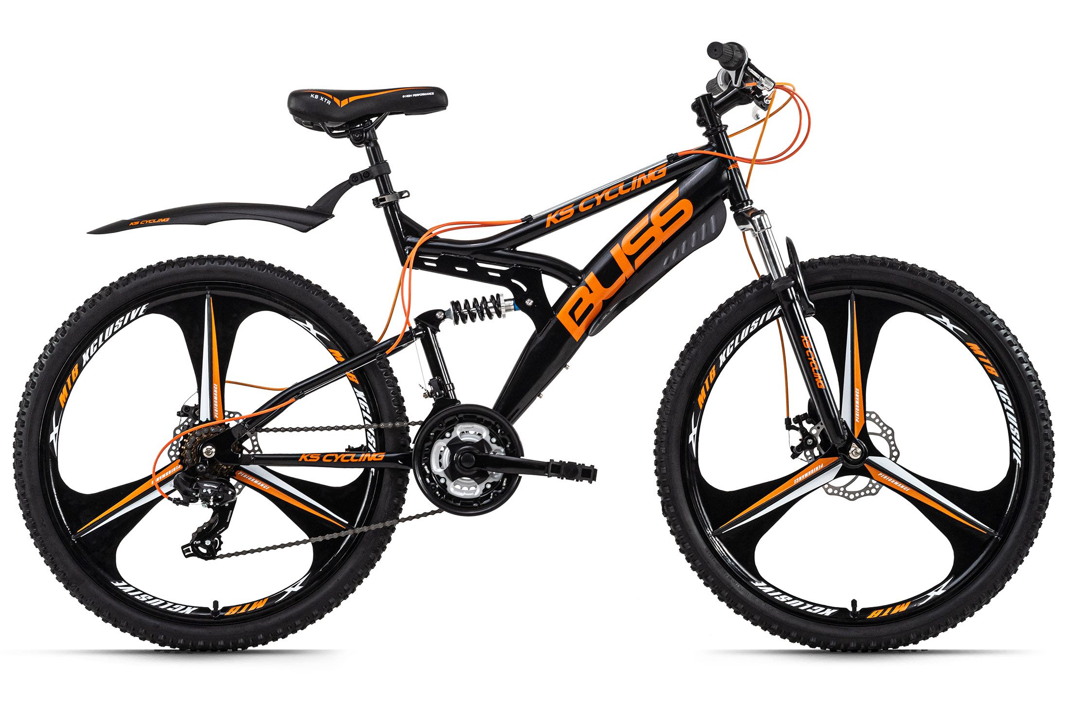 Stürzen Sie sich ins Abenteuer Mountainbiking: mit dem BLISS von KS Cycling! Das vollgefederte 26"-Mountainbike kommt ganz in Schwarz mit farblich passenden Decals und Kabelzügen. Auch Spritzschutz und Sattel sind a