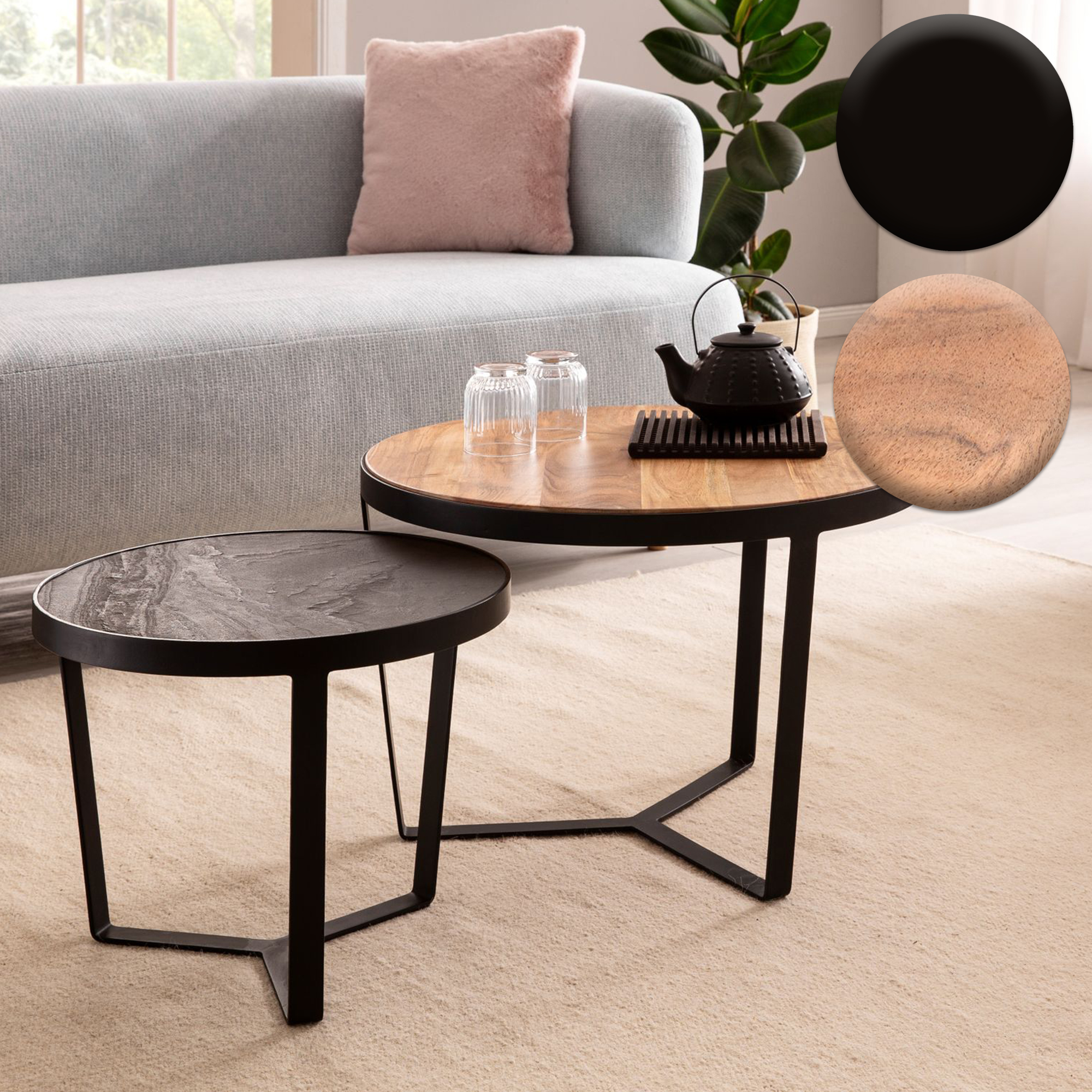 FineBuy Couchtisch 2er Set Akazie Massivholz / Steinoptik Wohnzimmertisch Rund, Satztisch mit Metallgestell, Kaffeetisch Modern, Sofatisch Verschachtelungstisch 2-teilig