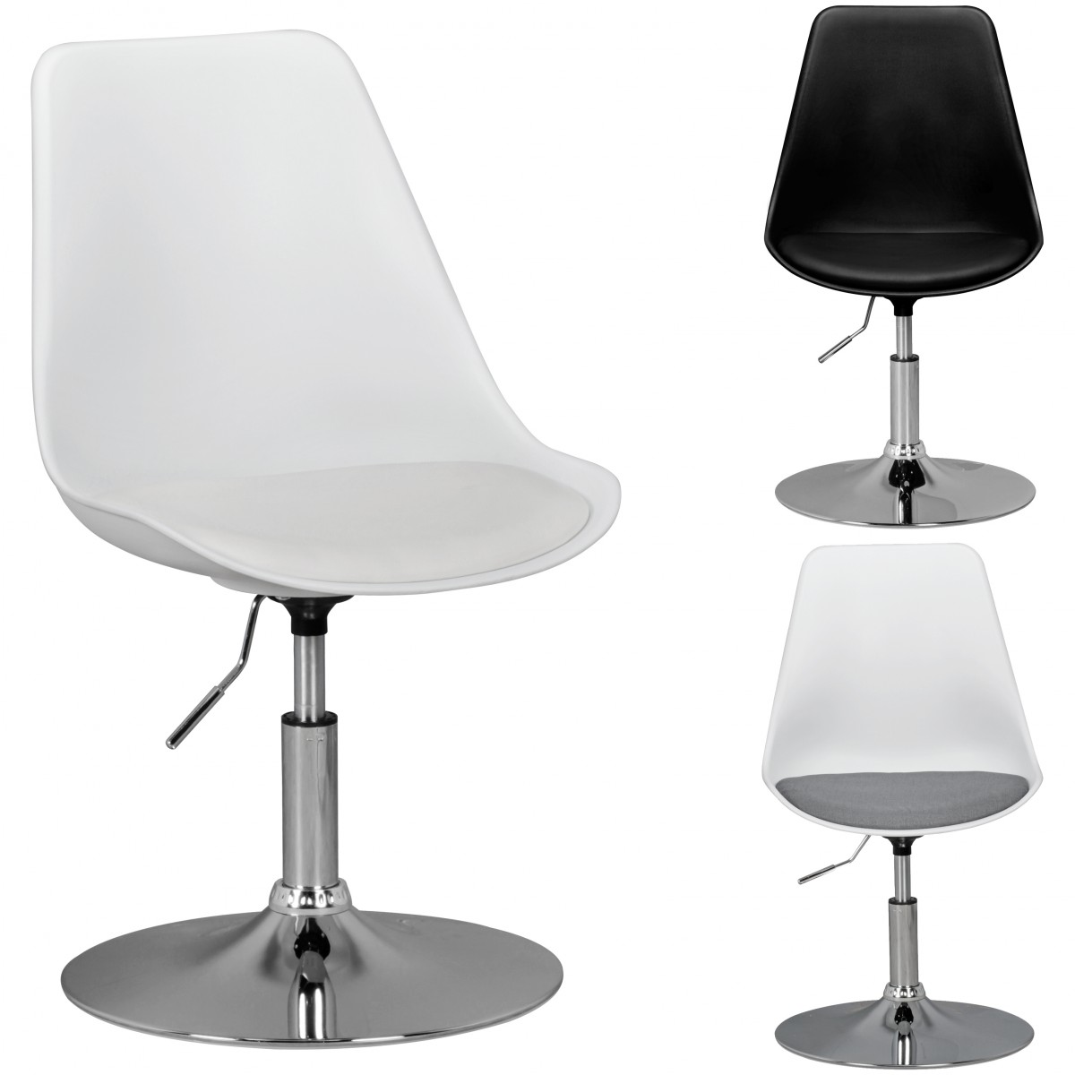 Design Sitzfläche mit Stoff bezogen Elegantes Gestell in Trompetenform mit Fußstütze Gestell aus verchromten Metall für optimale Stabilität Besonderheiten Sitz um 360° drehbar Fußplatte mit integrierter gummierter Umrand