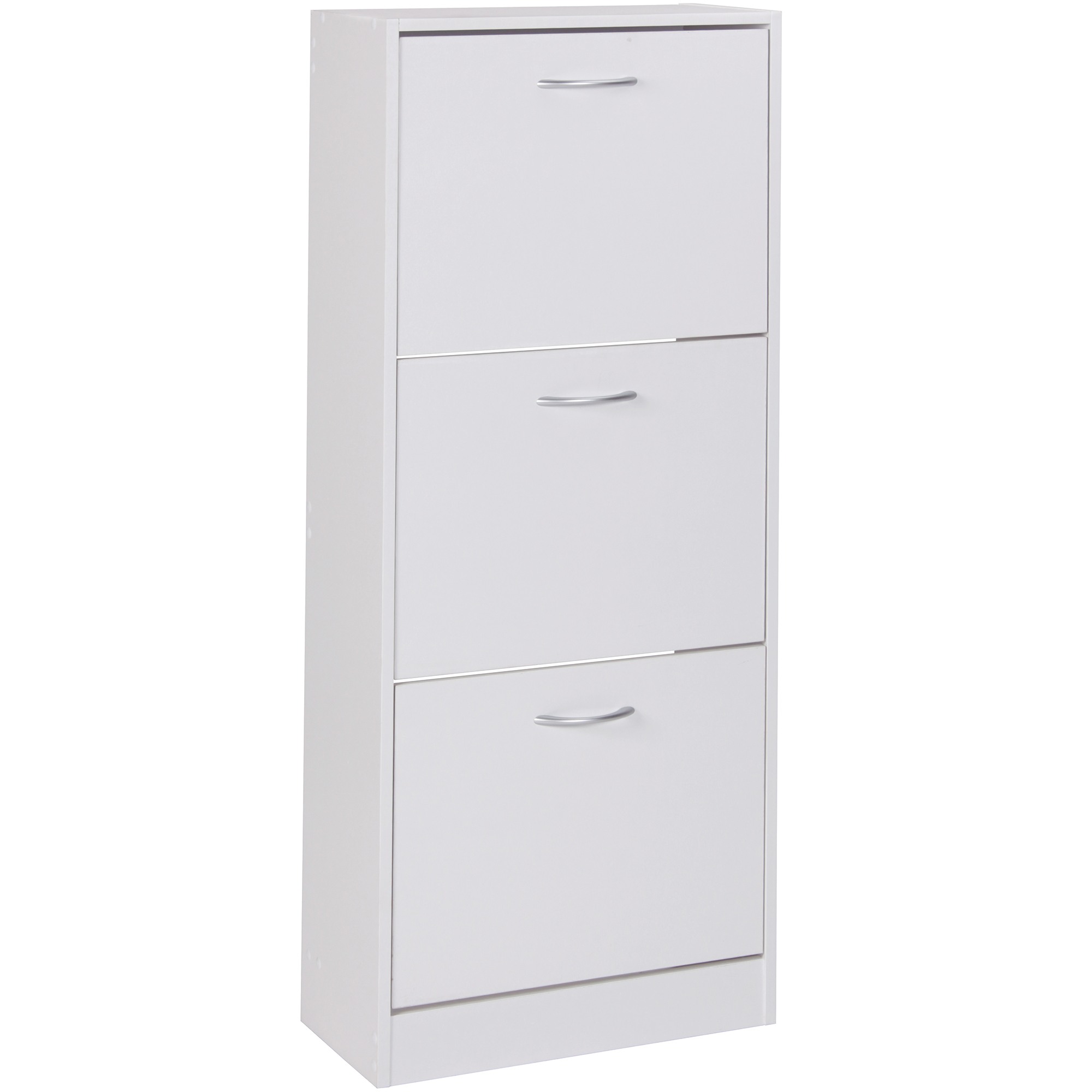 Design Schuhschrank mit 3 Fächern zum Aufklappen Praktische und integrierte Griffe an jedem Fach Modernes Design in weiß – Passend zu jeder Stilrichtung Abmessungen Breite: ca. 50 cm Höhe: ca. 125 cm Tiefe: ca. 24 cm Inn