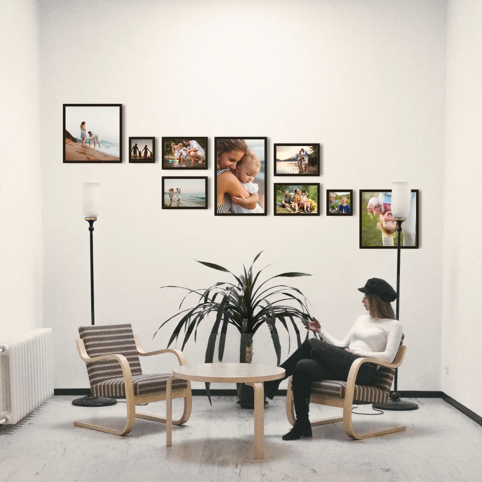 Personalisierte Fotowand mit gedruckten und gerahmten Bildern – alles in einem Framky ist eine personalisierte Fotowand mit gedruckten und gerahmten Bildern, die in nur 15 Minuten dank unseres selbstklebenden Montagesyst