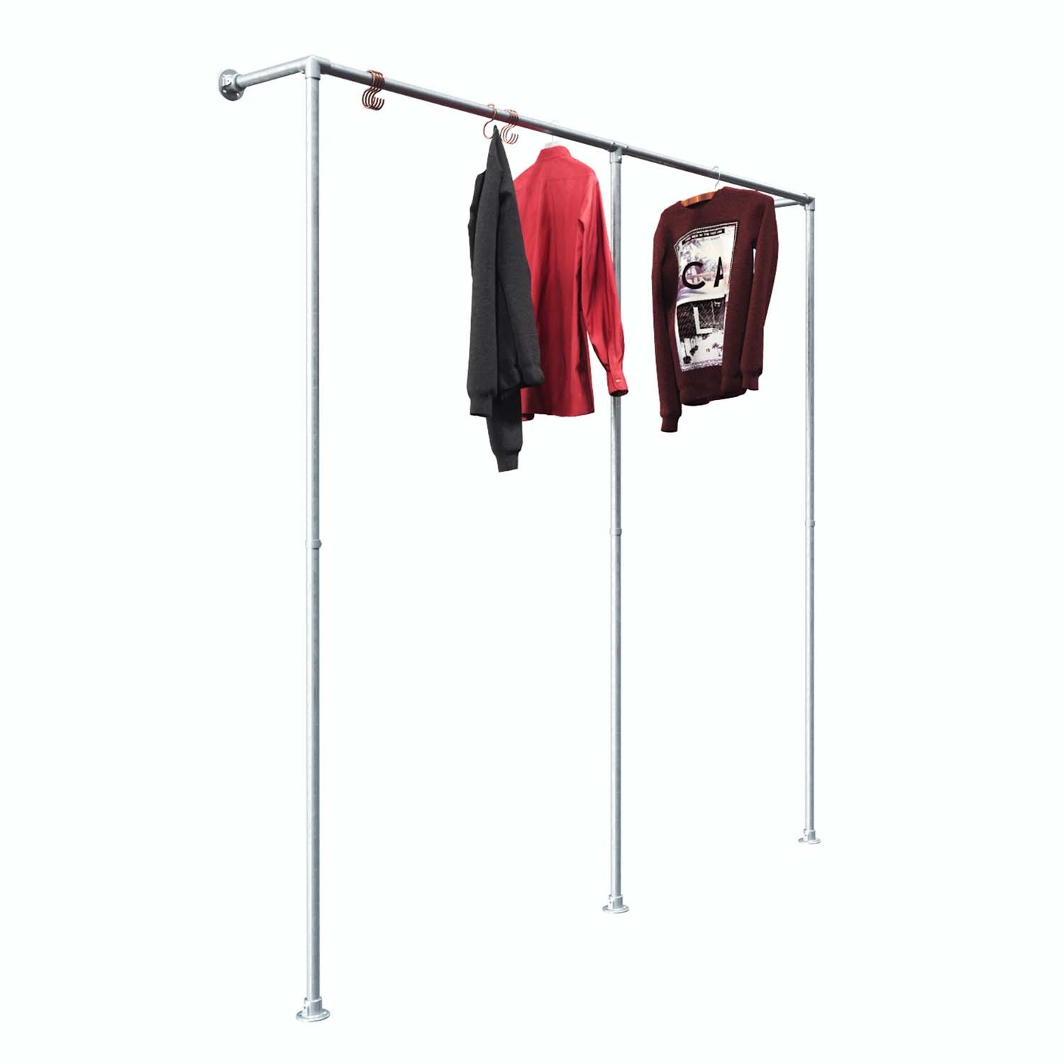 Modell Dresden: Das Walk-In-Doppelrack mit der Höhe von 200 cm ist in 5 Breiten – 150, 200, 250, 300 und 330 cm erhältlich. Die vertikale Mittelstange stabilisiert zusätzlich die Konstruktion und verhindert das Durchbieg