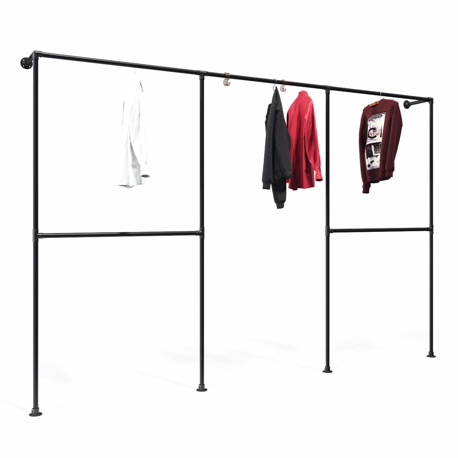 Modell Düsseldorf: Das 200 cm hohe Walk-In-Triple-Rack ist 225 cm breit. Der Mittel-Rack wird links und rechts von 2 Racks mit je eine Querstange flankiert. Die stabile Kombination ist perfekt für Verkaufsräume, Schneide