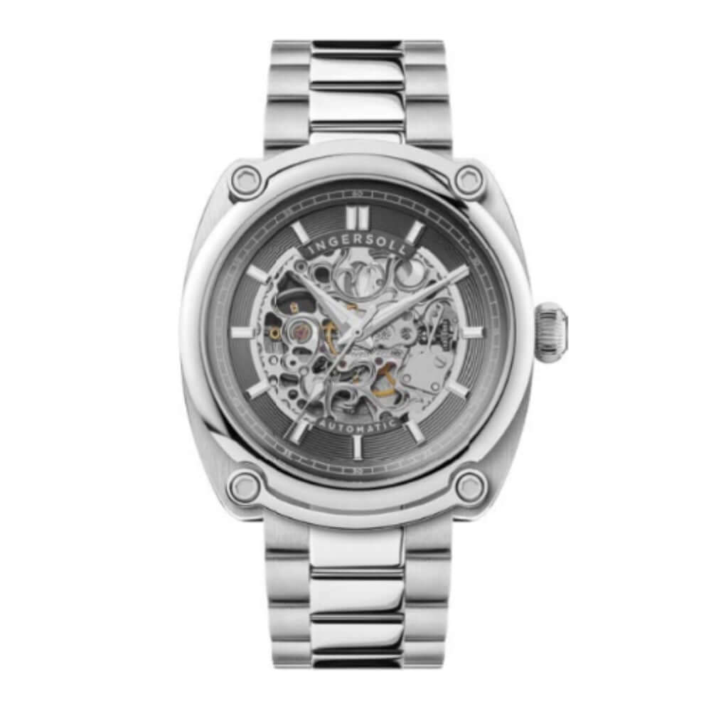 Ingersoll I13304 – The Michigan 45 mm. Gehäuse: Silber. Zifferblatt: Grau. Glas: kratzfestes Mineralglas. Armband: Stahl, Silber. Schließe: Faltschließe. Werk: Miyota 821A. Antrieb: Automatik/Skelettuhr. Wasserdichtigkei