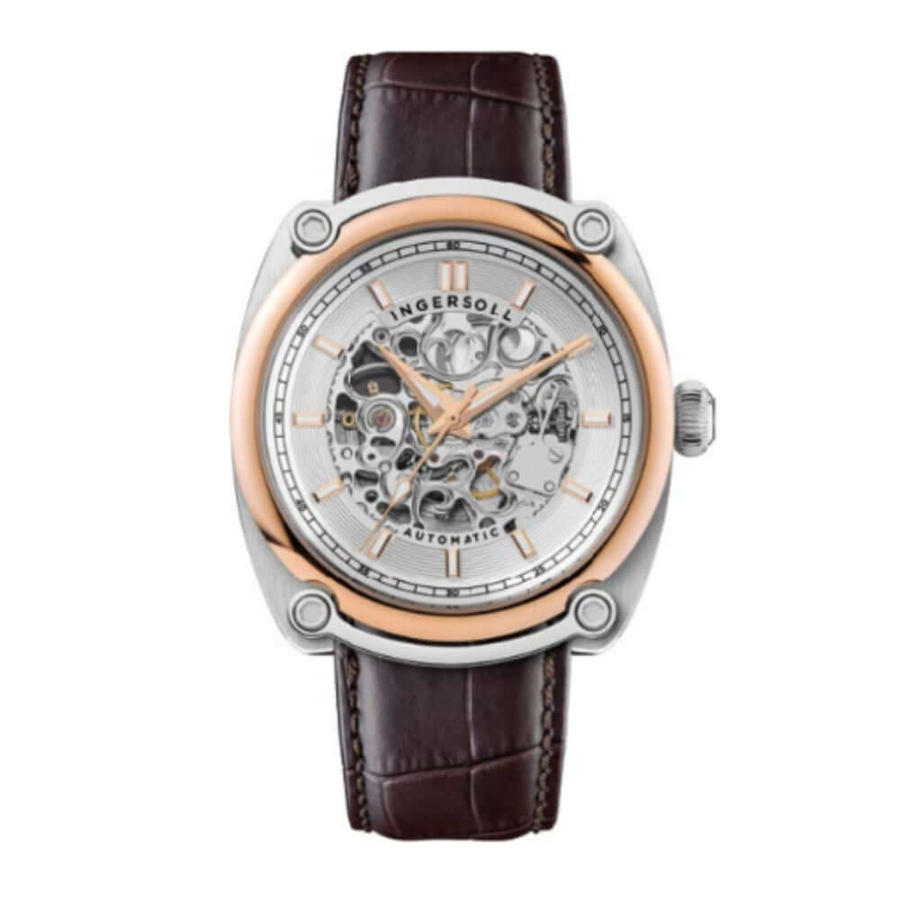Ingersoll I13302 – The Michigan 45 mm. Gehäuse: Rosegold/Silber. Zifferblatt: Silber. Glas: kratzfestes Mineralglas. Armband: Echtleder, Braun. Schließe: Dornschließe. Werk: Miyota 821A. Antrieb: Automatik/Skelettuhr. Wa