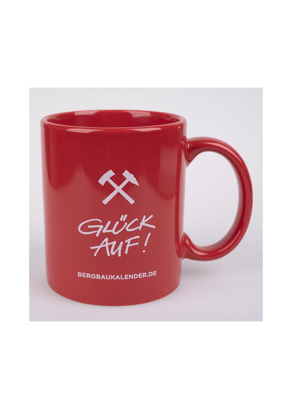 KAFFEEBECHER – Glück Auf! – rot Der Kaffee schmeckt aus diesem roten Keramik-Becher gleich viel besser! Das Bergbaumotiv Schlägel & Eisen und der handgeschriebene Schriftzug Glück Auf ! schmücken den Kaffeebecher, der ei