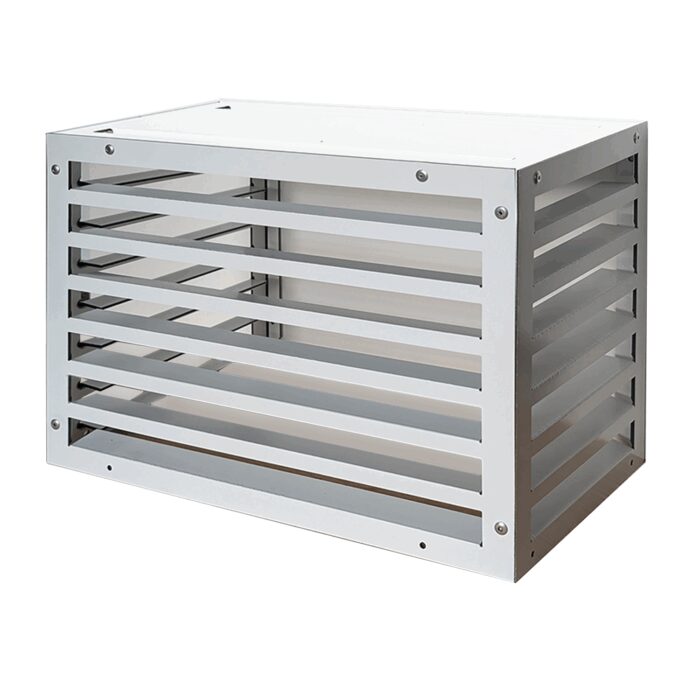 Funktionale und moderne Klimaanlage Verkleidung. Sie besteht aus separaten Wänden zur Selbstmontage. Schrauben und Nieten in passender Farbe sind im Set enthalten. Hergestellt aus einem langlebigen und wetterfesten Alumi