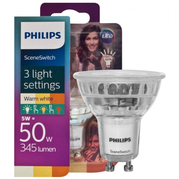 Die PHILIPS SceneSwitch Technik ermöglicht es, die Lichtstimmung und die Helligkeit des Leuchtmittel über ganz normale Wandschalter zu regeln. Es ist kein Dimmer erforderlich, die Lampe wird durch mehrmaliges An- bzw. Au