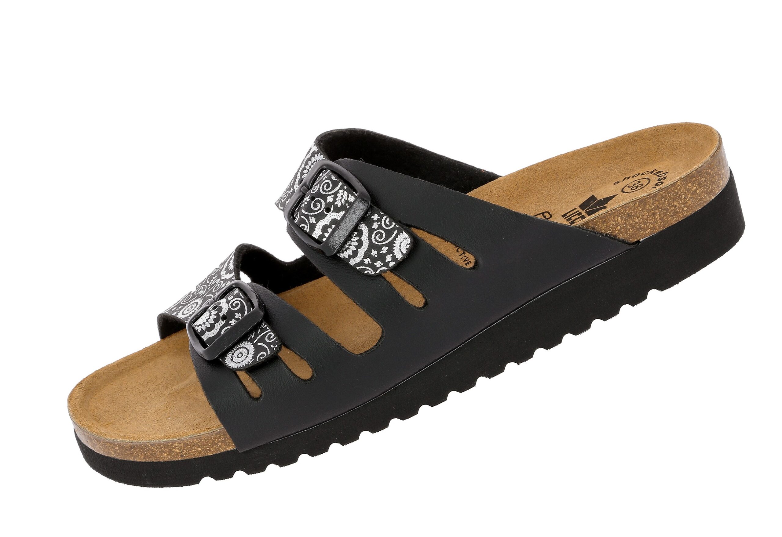 <p>Diese Ladies zeigen sich mit schwarzem, floralen Muster. <br />Durch das ausgeprägte Fußbett aus Kork und Kautschuk mit seiner schockabsorbierenden Dämpfung, läuft es sich einfach mega bequem – quasi wie a