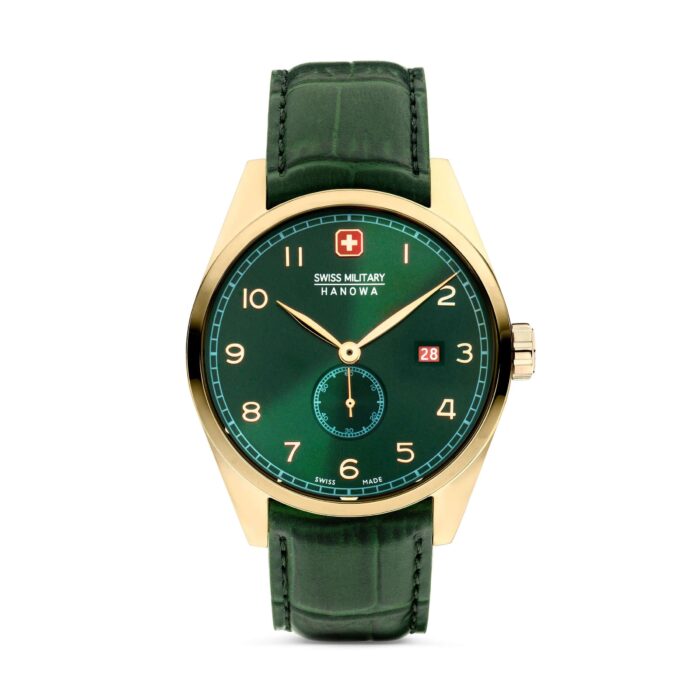 Case diameter: 42 MM. Case color: YELLOW GOLD PLATED. Case material: STAINLESS STEEL. ATM: 10, Crystal: CLEAR FLAT SAPPHIRE GLASS. Dial: GREEN DIAL. Band typ: LEATHER STRAP, Band material: GENUINE LEATHER. Band color: GR