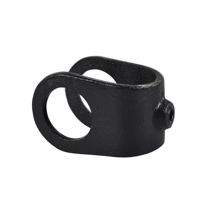 Kreuzstück, offen. 90°-Kreuzverbindungsschelle als Zusatz zu einer bestehenden Konstruktion. Ein weitere Vorteil der schwarzen Lackierung ist, dass diese tief in das Material eindringt und dem Verbinder ein extra hohes M