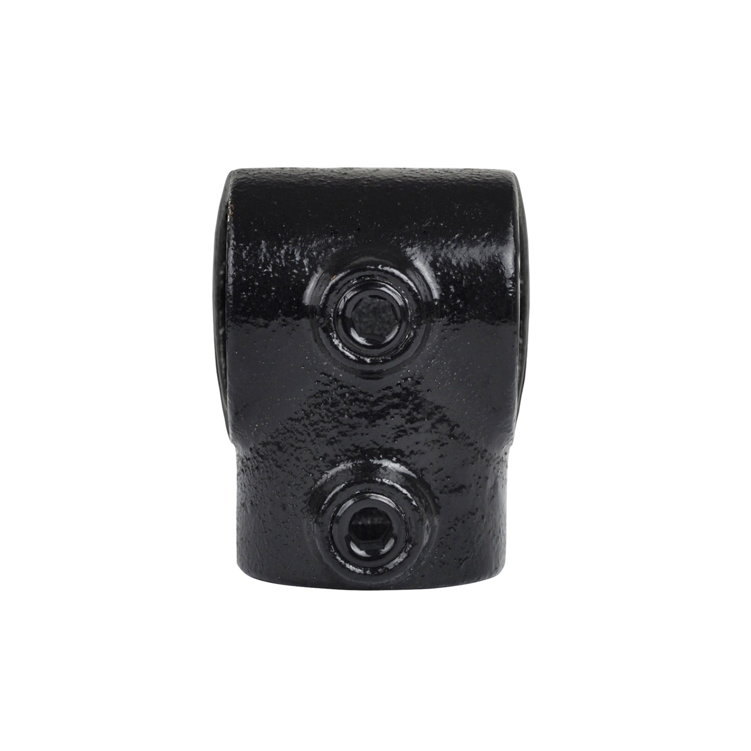 T-Stück, kurz. Zur Herstellung einer lotrechten Verbindung zwischen zwei Rohren. Oberer Rohrverbinder für gerade und waagerechte Geländerstützen. Dieser Rohrverbinder kann nicht benutzt werden, um ein horizontales Rohr i