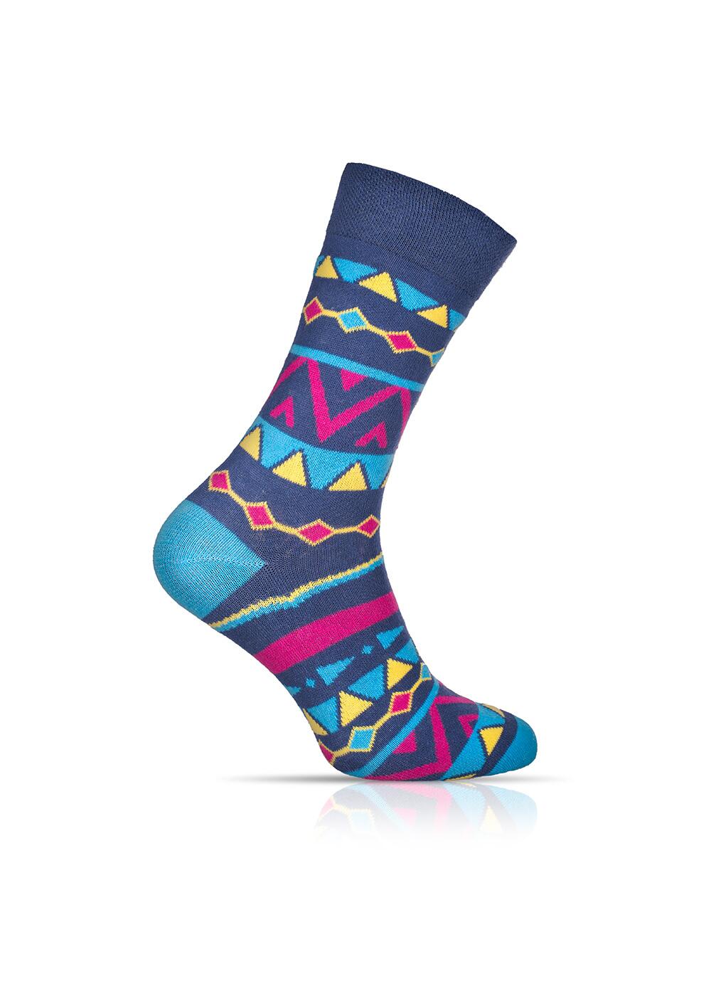 TRITA – Bunte Socken – Unisex Diese farbig gemusterte Socke im Grundton blau spielt mit dreieckigen Formen in pink, gelb und hellblau. Das Design der farbigen Socke stammt von Chilisocks, einer neuen Sockenmarke aus Thür