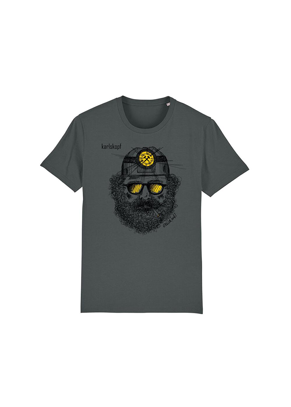 Rundhals T-Shirt BERGMANN – Biobaumwolle – Unisex – Farbe Anthrazit Glück Auf! Endlich können Sie ein wunderbares T-Shirt mit einem illustriertem BERGMANN mit Helm und Lampe tragen. Das kleine Modelabel KARLSKOPF aus Che
