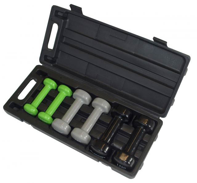 <p>6 kg Gewichte verteilt auf 3 Paar Hanteln: <br />2 x 0.5 kg, 2 x 1.0 kg und 2 x 1.5 kg<br /><br />Die Kurzhanteln haben einen Gußeisenkern mit strapazierfähiger und griffiger Vinyl-Ummantelung.