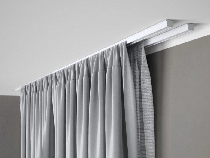 Vorhangschiene aus Aluminium doppelt D150. Dieses Vorhangstangensystem ermöglicht die Installation von zwei Stangen für transparente Vorhänge und Gardinen. Hergestellt aus Aluminium, ist es langlebig und feuchtigkeitsbes